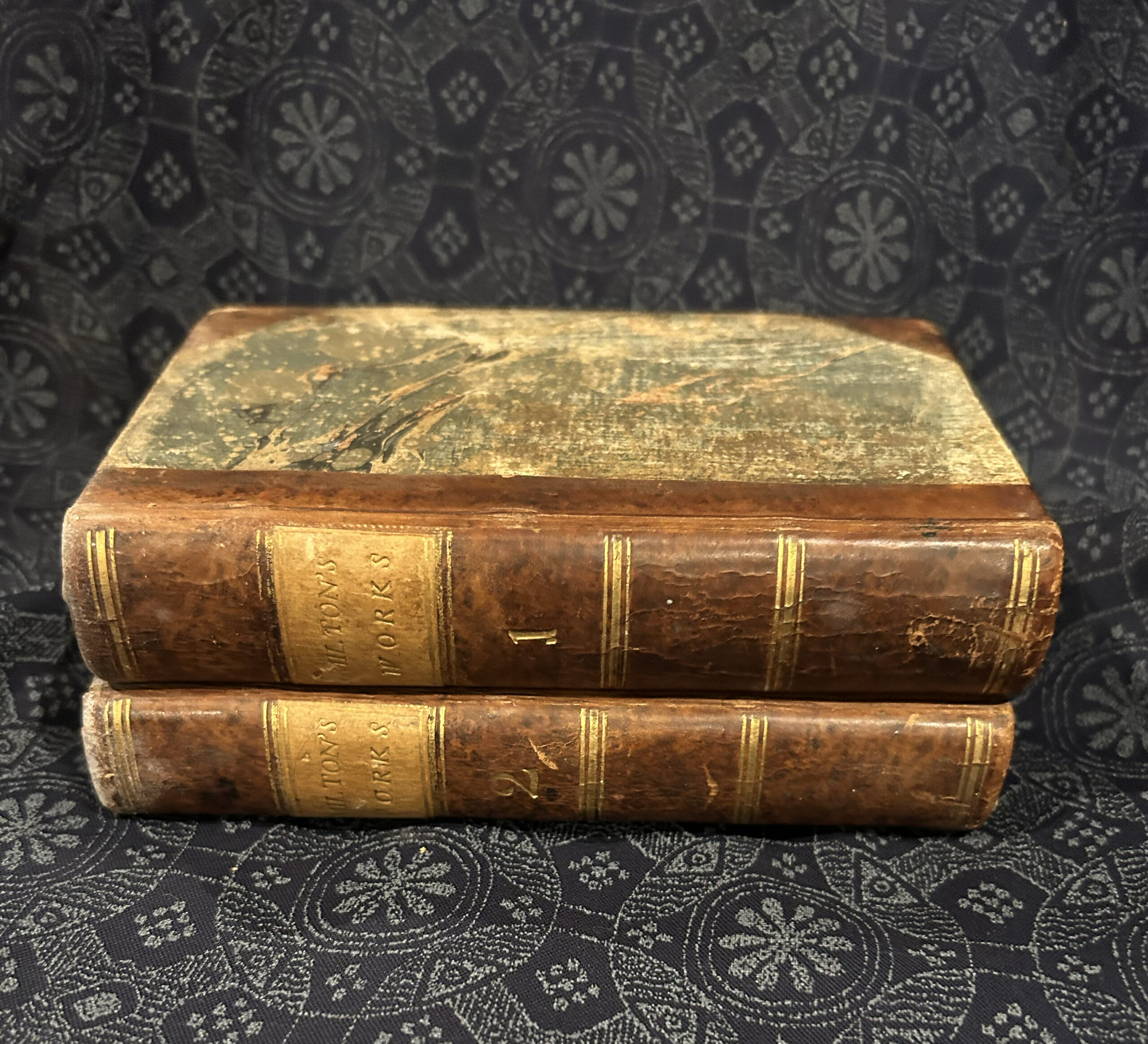 Paradise Lost in Twelve Books, two volumes. Cook’s edition. 1796 Excellent quarter binding with marbled boards. Well preserved calf spines. The Poetical Works of John Milton. From the Text of Dr. Newton. With the Life of the Author and Critique of Paradise Lost, by Joseph Addison, Esq. Cooke s Edition. Includes Paradise Regained, Comus and other Works.Printed in London for C. Cooke. 1796. 278 and 296 pp. 5.75 x 3.75 . Beautiful engravings Hardcover 1/4 leather. Overall good, with some scuffing and losses to leather across boards and spines. General age-related toning to pages, along with intermittent foxing and wear.