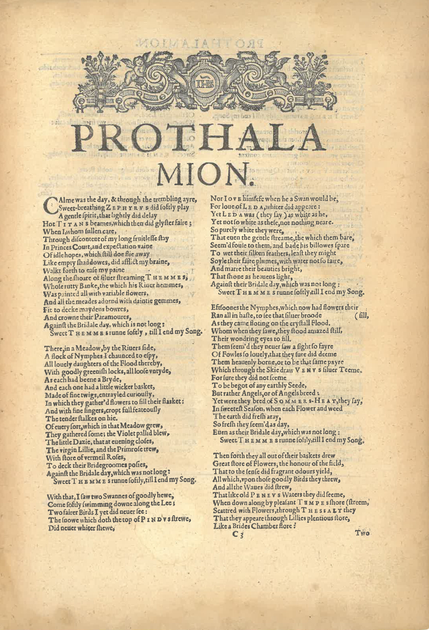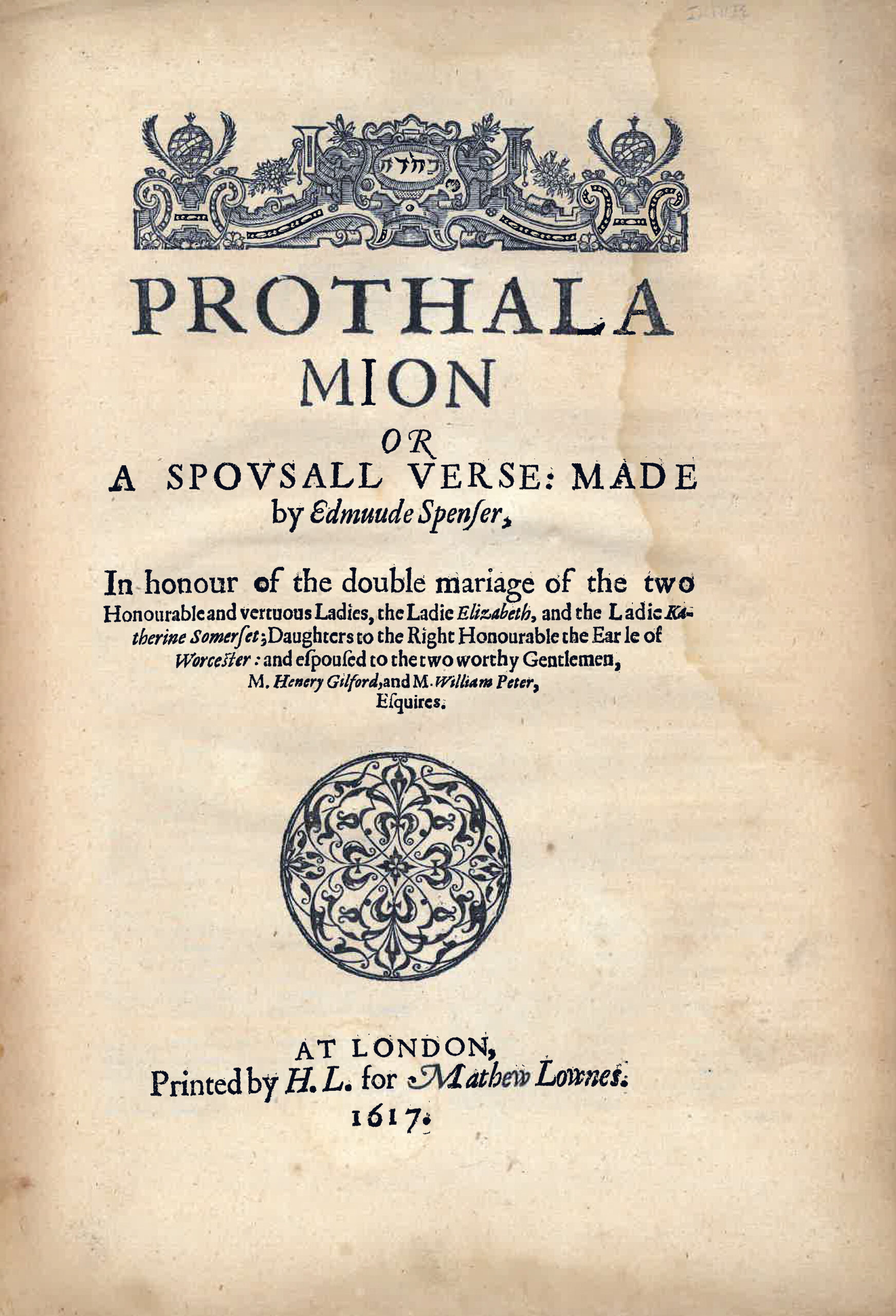 Prothalamion: or, A spousall verse made by Edmund Spenser. : In honour of the double mariage of the two honorable & vertuous ladies, the Ladie Elizabeth and the Ladie Katherine Somerset, daughters to the Right Honourable the Earle of Worcester, and espoused to the two worthie gentlemen, M. Henry Gilford and M. William Peter, Esquyers.